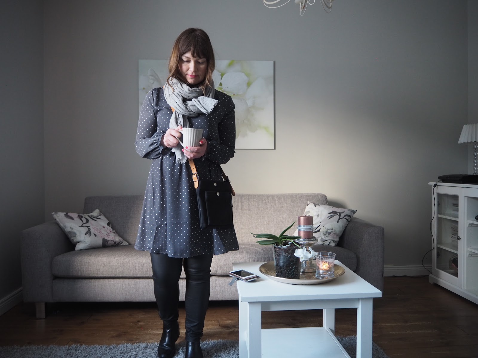 Toisessa kuvassa sukkahousut on vaihtunut tekonahka housuihin ja lisäsin huivin.