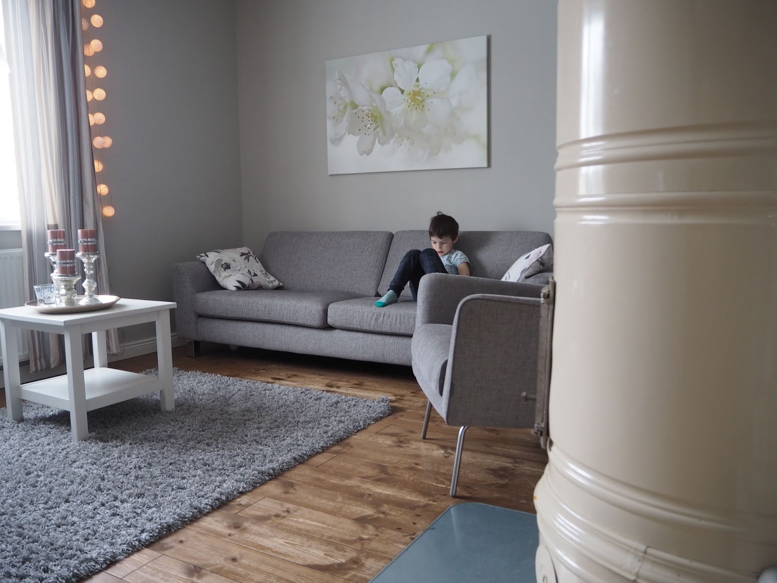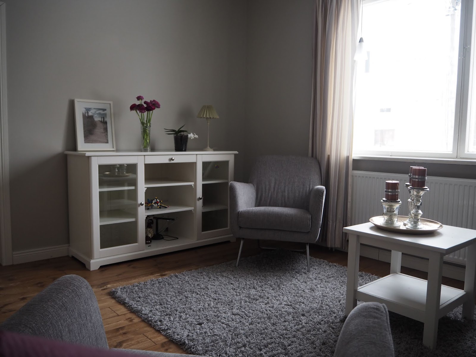 Eilisen inspiraation seurauksena laitoimme olohuoneeseen uuden järjestyksen. Pitkään olen jo pähkäillyt kirjahyllyn kohtaloa, joutaisiko se kierrätykseen ja laittaisin matalamman lipaston tilalle. Mutta nyt uudelleen järjestelemisen seuraksena ei tarvitse hankkia uutta eikä luopua vanhasta ainakaan hetkeen.