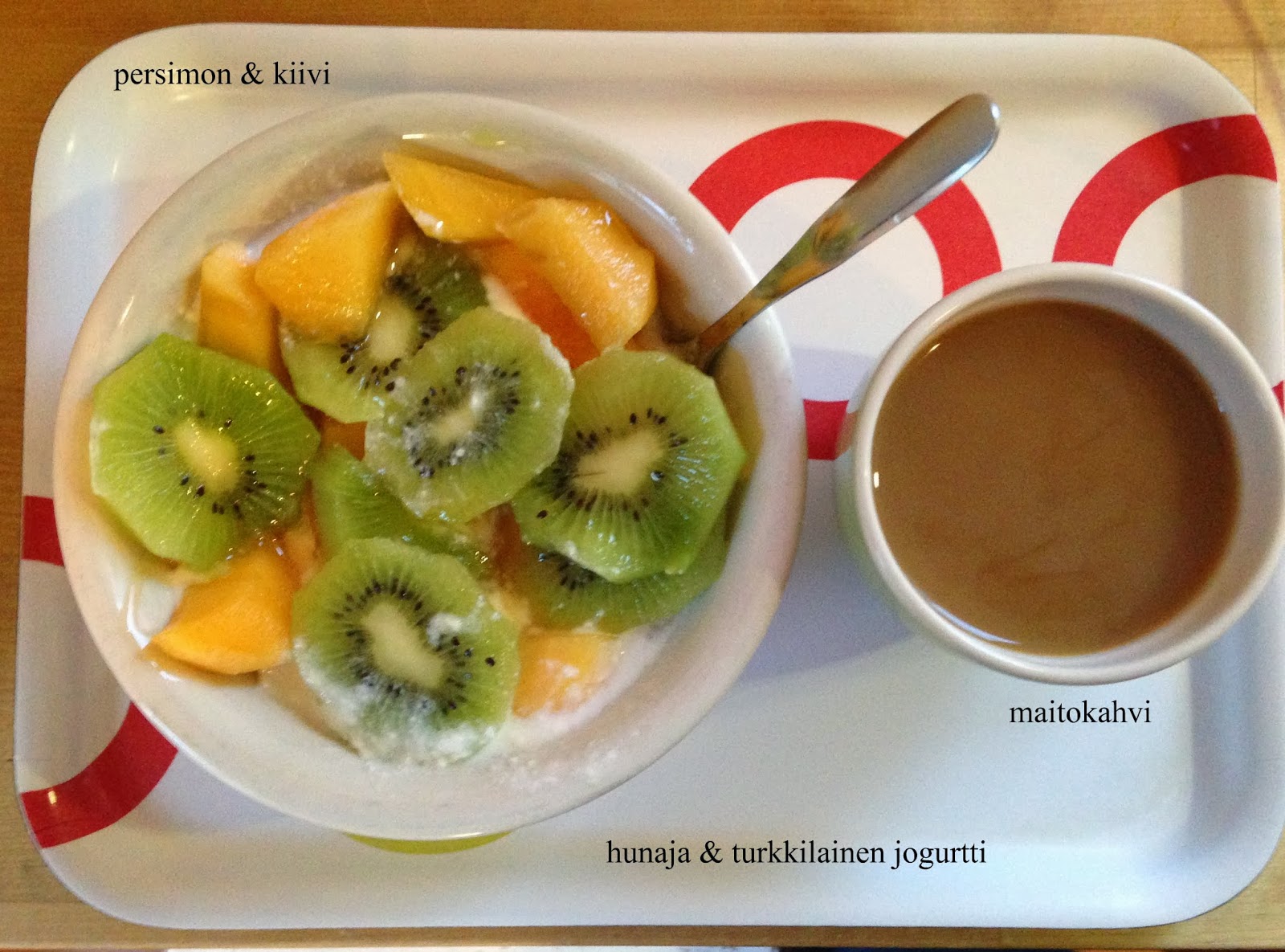 Toinen on sitten aamuvälipala (välipala aamupalan ja lounaan välillä). Kevyt turkkilainen jogurtti, joka on mielestäni parempi kuin normaali rasvainen, eli siis sitä ja päälle pilkottu persimon ja kiivi ja loraus hunajaa. Hyvä ja taatusti terveellinen välipala, suosittelen.