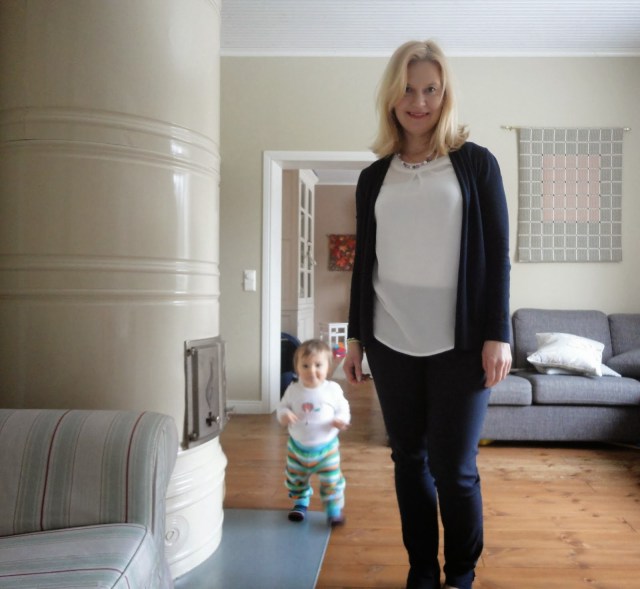 Asua eiliseltä; valkoista ja tummansinistä. Mielestäni raikas väriyhdistelmä. Tummansininen mielestäni lempeämpi kuin musta. Yksinkertaisella asulla mentiin. Ensin mietin laittavani korkkarit, mukavuus kuitenkin voitti ja laitoin saappaat jalkaan.
