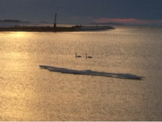 Loppuun vielä mielestäni kaunis kuva kahdesta joutsenesta merellä. Jotenkin ihana tunnelma tässä, vaikka kuva onkin huonolaatuinen. 🙂