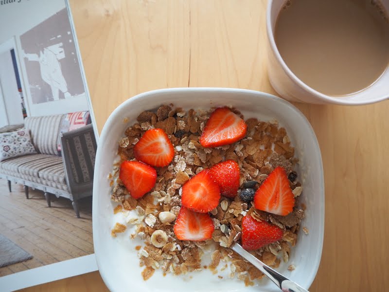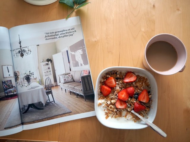 Aamupalan ohessa, jos satun olemaan yksin selailen kännykkää tai lehtiä. Poikien kanssa ollessa ei paljon ehdi selailemaan mitään, vaan syödään pikaiset aamupalat ja kaiken maailman säätämisen ja sähläilyn jälkeen pääsemme lähtemään päivähoitoon ja töihin.