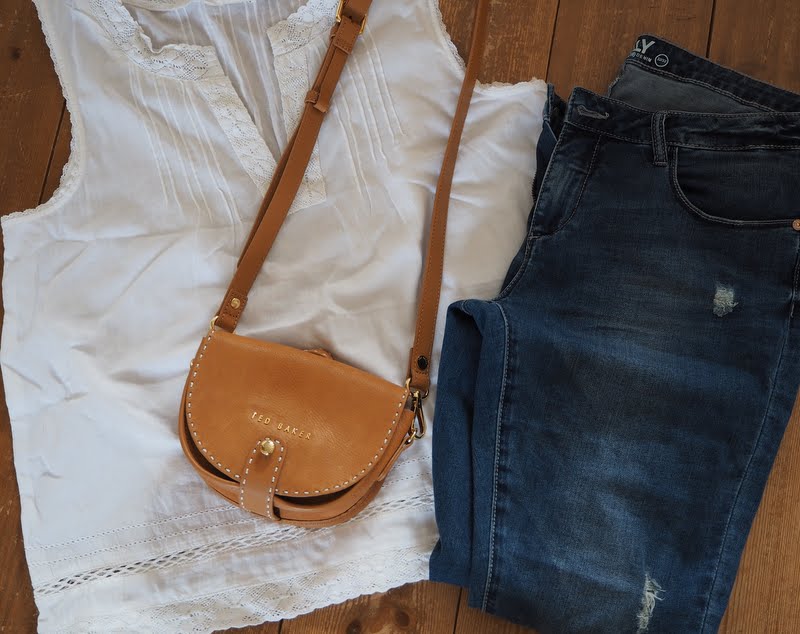 Suosikki asu yhdistelmä laukun kanssa on tämä yllä näkyvä eli farkut ja valkoinen pitsitoppi.
