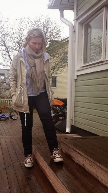 takki stadiumista, huivi ja housut h&m, paita esprit, kengät converset