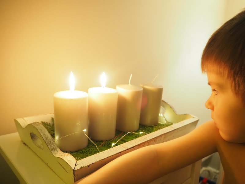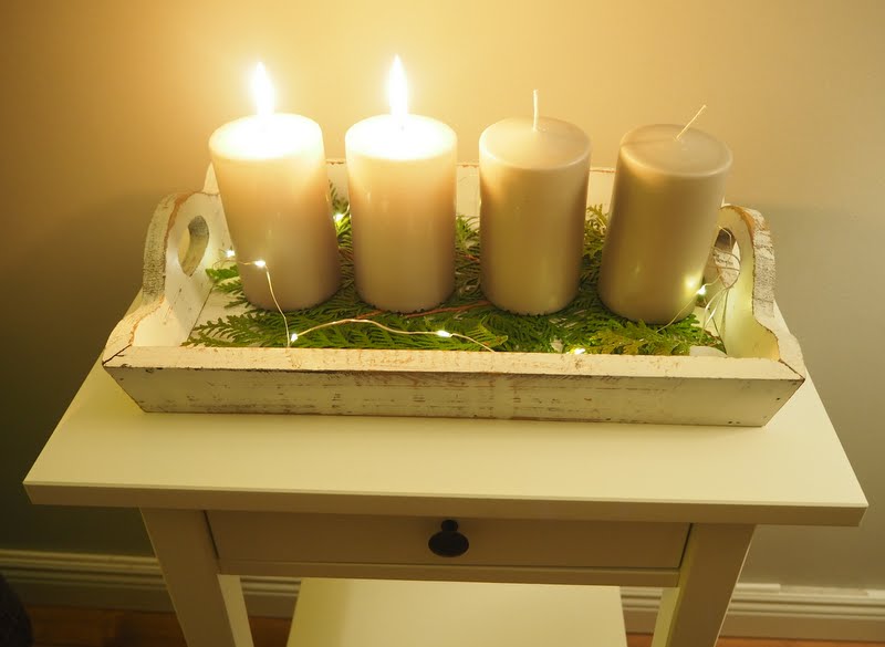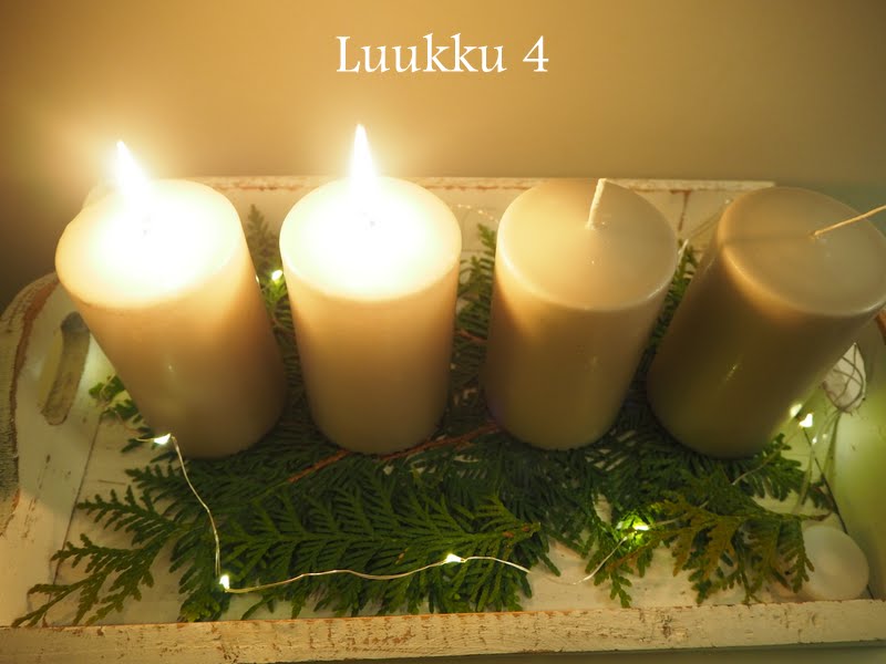 Tänään luukusta paljastuu toisen adventtisunnuntain kunniaksi adventti kynttilät. Tällainen helposti toteutettava diy, eli niinkuin kuvasta näkyykin; tarjotin, tuijan tai kuusen havuja, pienet ledivalot ja tietysti kynttilät. Olisin halunnut laittaa kynttilöihin numerot yhdestä neljään, mutta en niitä mistään löytänyt.