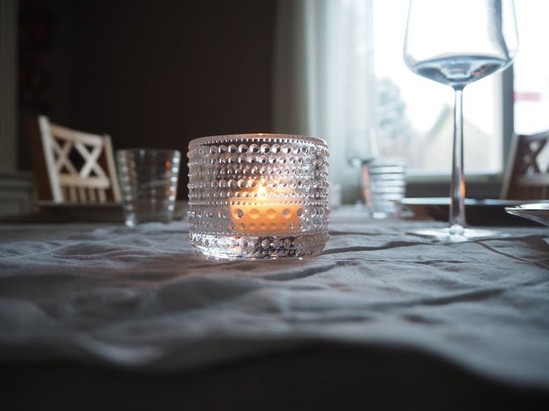 Kotimaisia kynttilöitä ollaan poltettu suomalaisissa Iittalan tuikkukipoissa. Lounaaksi syötiin kotimaista poroa ja suomalaisia perunoita.