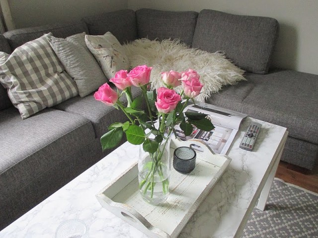 Marmoripinnan pöytään tein bauhausista ostetusta kontaktimuovista, jossa on tuollainen marmorikuviointi. Ja kappas vaan pinnasta tuli mielestäni aikalailla oikean marmoripinnan näköinen. Pöydän jalat maalasin valkoisella kalustemaalilla, maalaukseen käytin pientä maalaustelaa. Maalaus pinta ei ole ihan sileä, mutta en anna sen häiritä. Ero on huomattava pöydän entiseen ulkomuotoon verrattuna.
