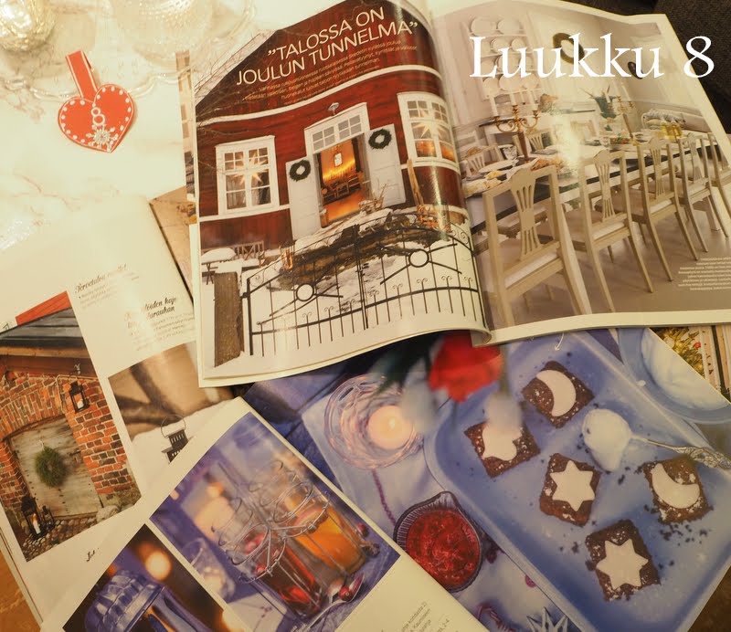 Luukku kahdeksasta paljastuu joululehdet, lähinnä sisustukseen liittyvät lehdet. Yleensä ostan jonkun joululehden, josta saan uutta inspiraatiota joulutunnelman luomiseen. Tykkään katsella kauniita sisustuksia ja koristeita, mutta jos alan lehden ohjeen  mukaan tekemään vaikka koristeita, niin arvatenkin lopputulos on kaikkea muuta kuin esimerkin mukainen. Joten jätän askartelut suosiolla toisille. Vielä ei ole tullut vastaan sellaista diy:tä, johon olisin ollut itse tyytyväinen.