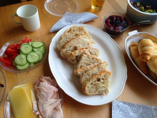 5 dl kädenlämpöistä vettä1 dl maitoa25 g hiivaa (1/2 pakettia)2 tl suolaa1 rkl hunajaa12 1/2 dl vehnäjauhojavehnäjauhoja leipomiseenvalmistus: hiiva murustellaan suolan ja hunajan joukkoon. Ja niiden päälle kaadetaan kädenlämpöinen vesi ja maitoseos. Sekoita niin kauan, kunnes hiiva on liuennut nesteen joukkoon. Lisää jauhot koko ajan sekoittaen ja vaivaa taikinaa niin kauan, että se irtoaa vähän kulhosta ja anna taikinan kohonta 1/2-11/2 tuntia. Kun taikina on kohonnut, tee siitä sämpylöitä tai leipä. Alkuperäinen ohje löytyy täältä. Salaatin ohje täältä.