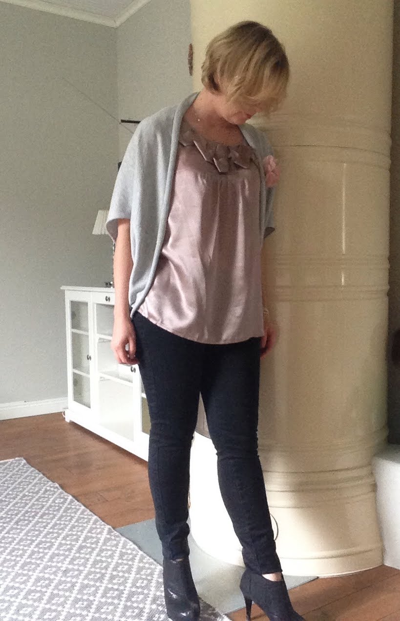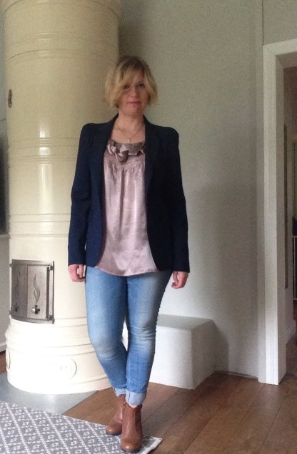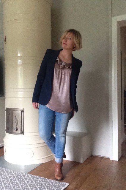 Asu kaksi. Silkkipaidan kaverina bleiseri, tälläinen voisi olla sopiva vaikka työasuksi, tietenkin riippuen työpaikasta. Rentoutta asuun tuo farkut ja nilkkurit. Tällä voisi mennä kaupungille milloin tahansa. Tosi mukava päällä ja sopivan arkinen juurikin farkkujen ansioista. Tuntisin oloni vieraaksi, jos tähän yhdistäisi suorat housut.