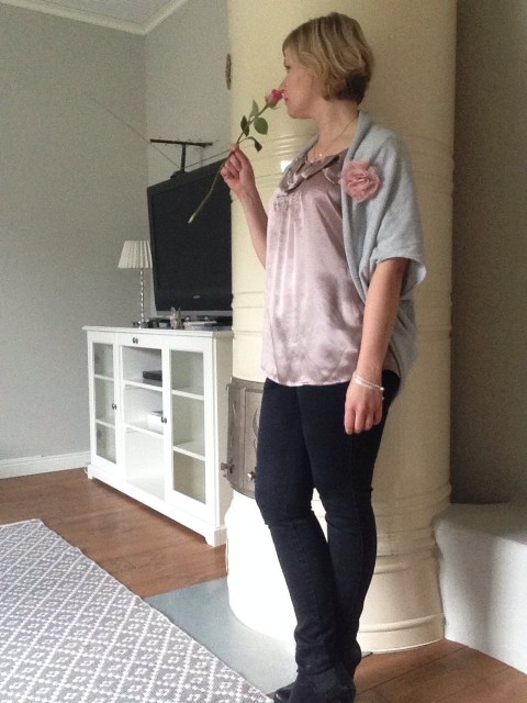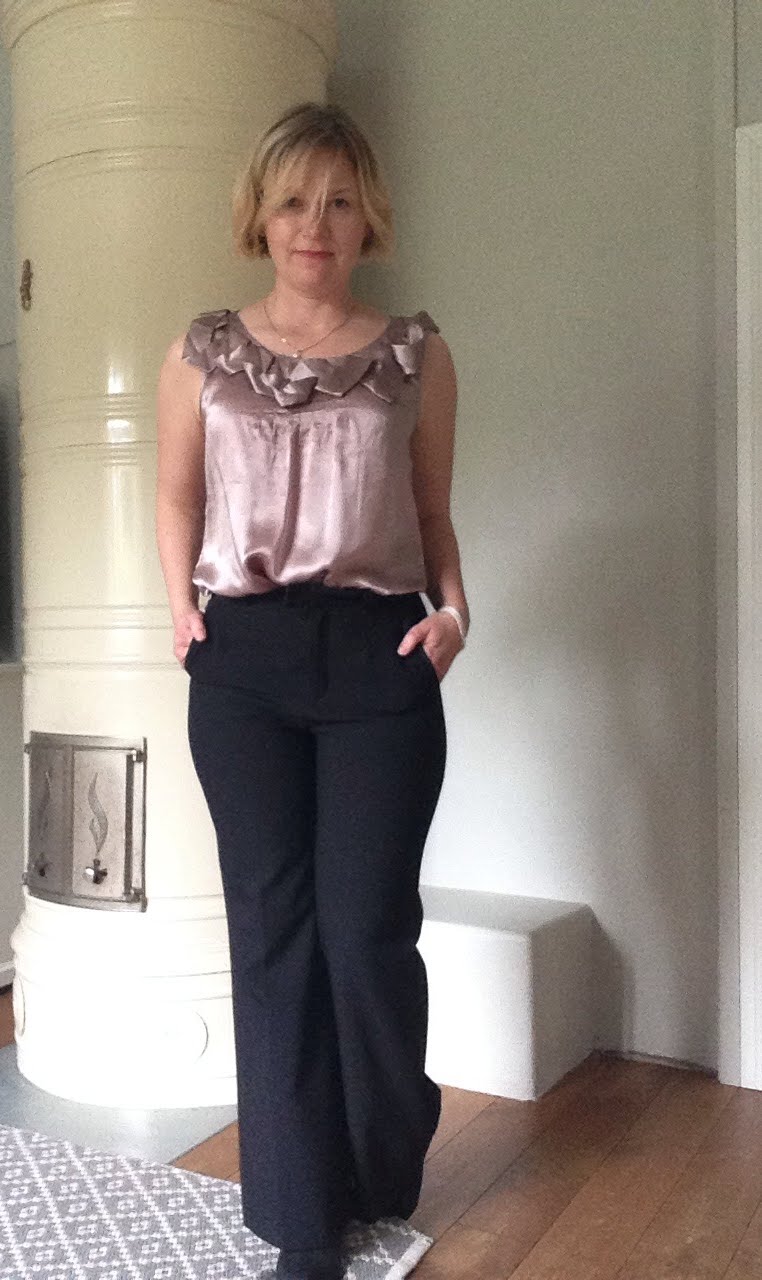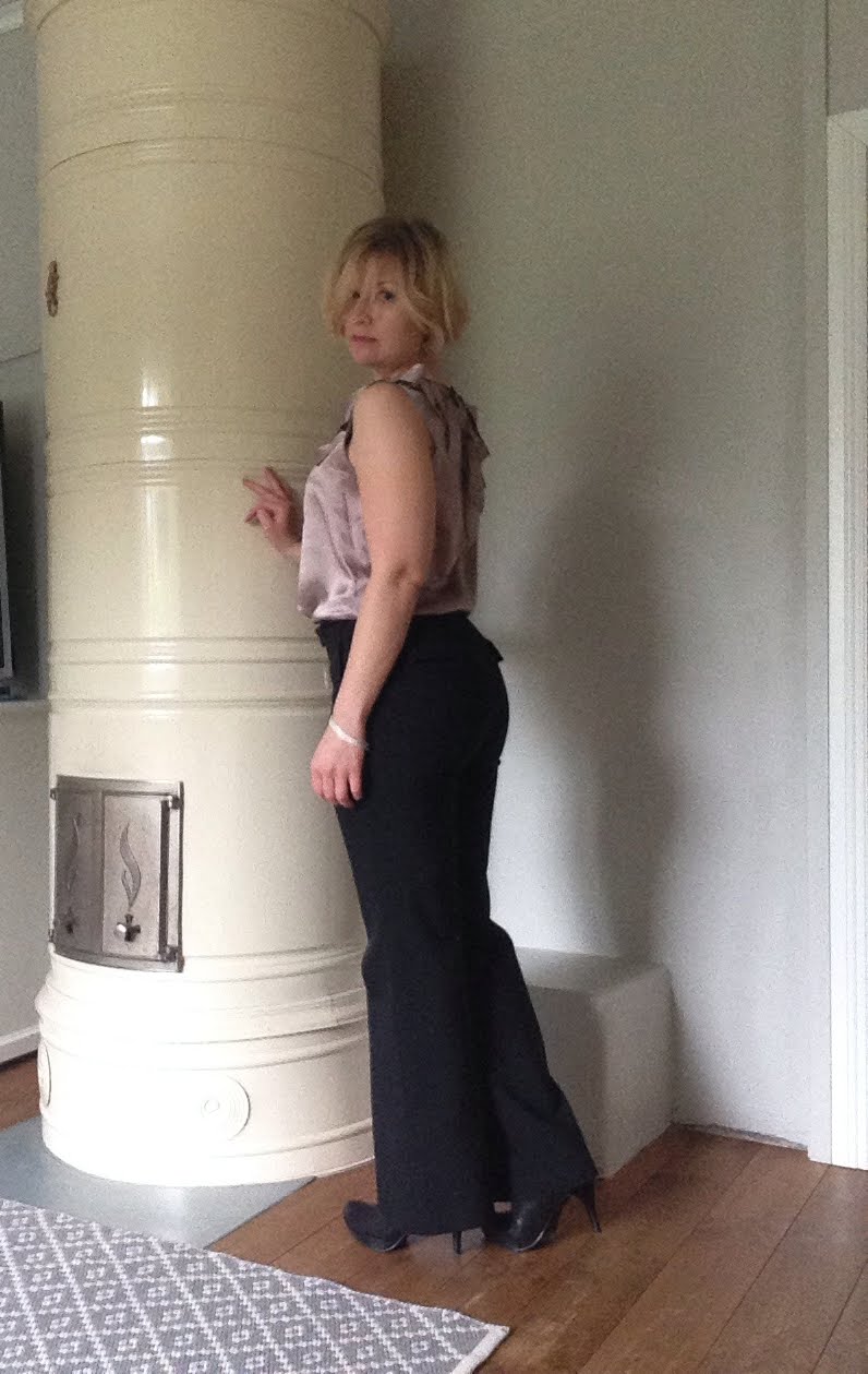 Viimeisenä mielestäni sopiva asu teatteriin, syömään tai pirskeisiin, Tämäkin erittäin miellyttävä päällä. Vaikkakin housut ovat, jostain kumman syystä jäänet hieman pieniksi reisistä, kyseessähän on kymmenen vuotta vanhat housut. Mielestäni kivata vaihtelua nämä leveä lahkeiset housut.