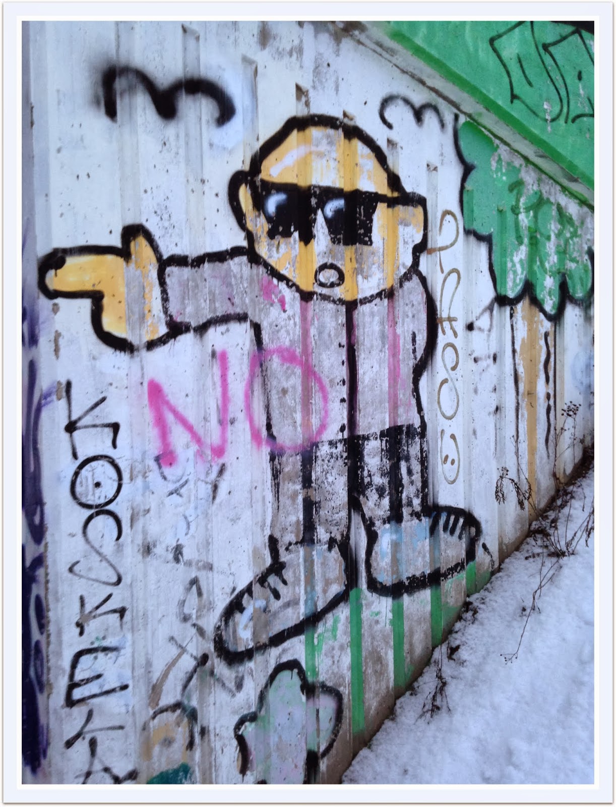 Tässä olisi taidetta meidän kulmilta, yks alikulku silta, johon välillä vaihtuu nämä teokset. Eipä siinä ihan kivojahan nämä on.